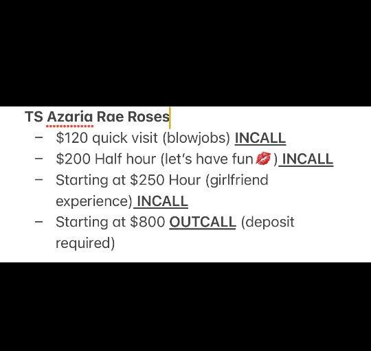 TS Azaria Rae - your 1 stop shop girlfriend experience. Looking for a sexy trans girl, 100% authentic, fully functional, completely versatile, in a SAFE area, luxury location, and discreet Look no further Location: NW DC Equipment: 9inch fully functional (she explodes), top+bottom = fully vers., love kissing, love oral, soft booty No drama Serious inquiries only